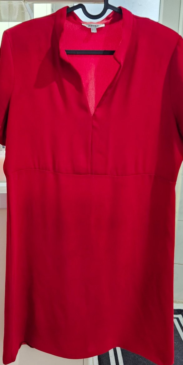 Kırmızı renkte, hakim yakalı, vatkalı omuzlu elbise. İpek gibi kumaştan, midi boyda, ofis için ve kına için uygun. Çok fazla giyilmedi. Zayıfladığım için satıyorum.