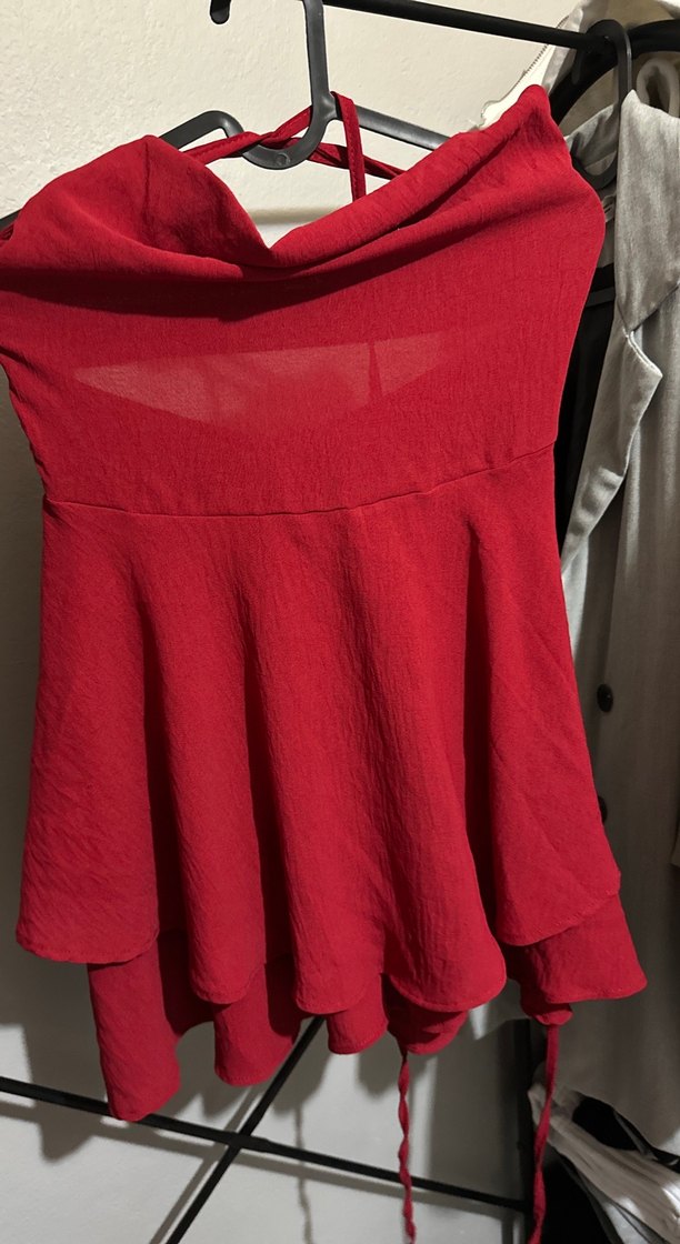 Keten kumaştan, kırmızı renkte, drapeli ve midi boyda, fitted kesim. Minimalist sokak stiliyle romantik akşamlar için uygun. ❤️