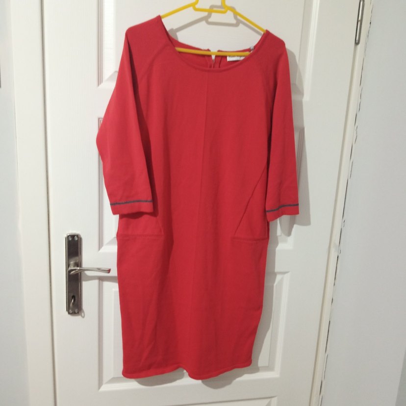 Kırmızı renkte, kısa kollu, bisiklet yaka, bol kesim hamile midi tunik. Rahat sentetik kumaştan, gündelik kullanıma uygun minimal normcore tarzda.