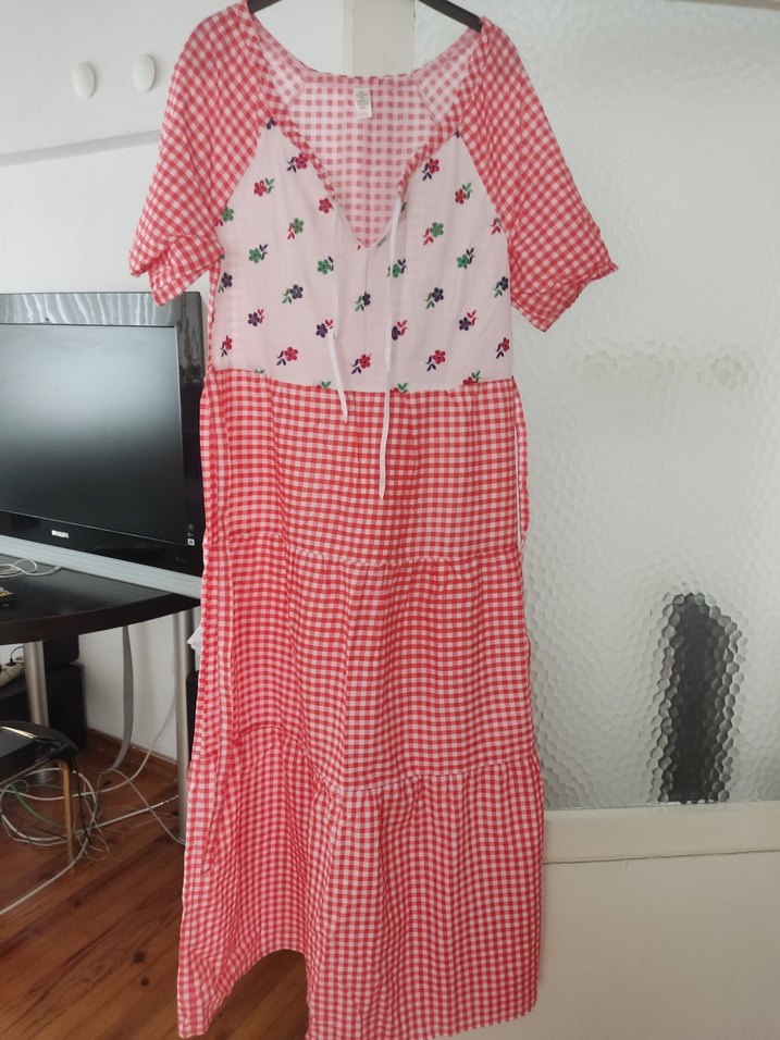 Uzun boy, gevşek kesim hamile ve emzirme elbisesi. Kırmızı ekose ve küçük çiçek desenli, kısa balon kollu, önünde bağcıklı V yaka.