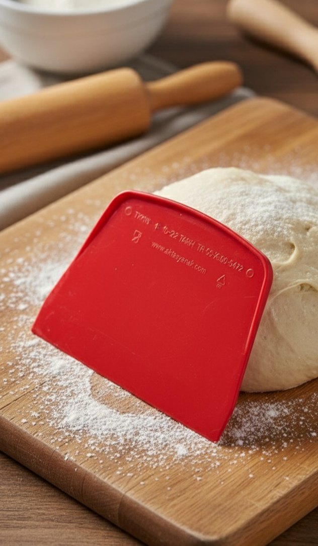 Canlı kırmızı renkte, esnek malzemeden yapılmış hamur kazıyıcı. Hamur işlerinde kullanıma uygundur.