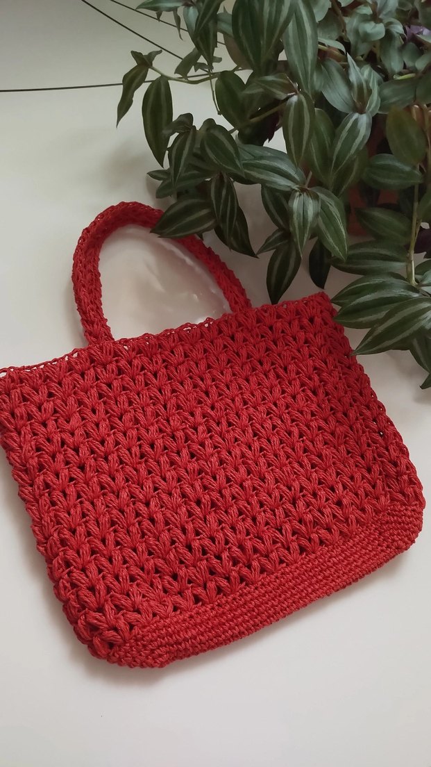 El emeği kırmızı örgü malzemeden, dantel detaylı, bohem tarzda renkli kadın çantasıdır.
