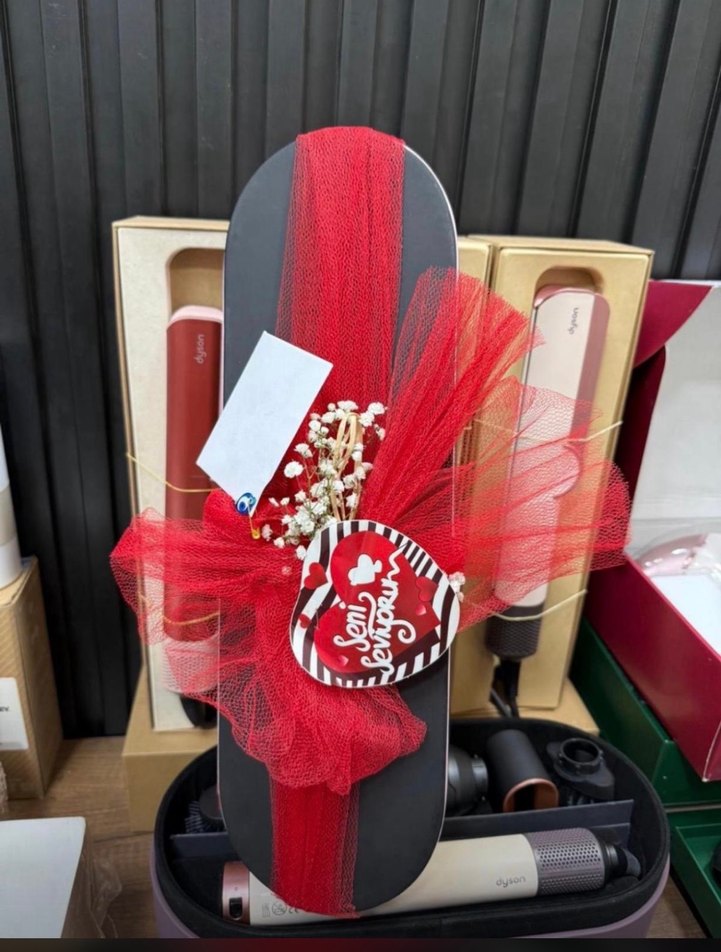 Kırmızı tül kurdele ve kalp şeklinde etiketle süslenmiş hediye kutusu içinde çeşitli aksesuarlar bulunmaktadır.