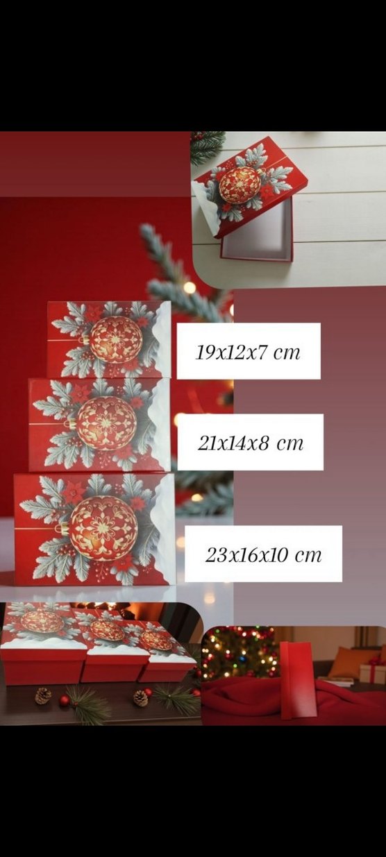 19x12x7 cm, 21x14x8 cm ve 23x16x10 cm boyutlarında, çiçek desenli kırmızı hediyelik kutular seti.