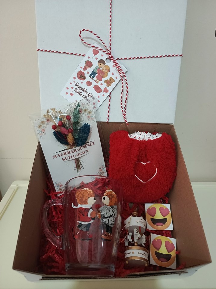 Kutuda, aşk temalı illüstrasyonlu şeffaf kupa, kalp detaylı kırmızı peluş kupa kılıfı ve emoji temalı iki küçük ürün yer alıyor.
