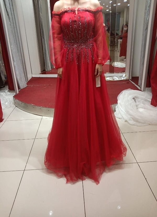 Sadece 1 saat abimin düğününde (pandemi dönemi) giydim. Hata yok. Boydan 1.70. Kruvaze yaka. Göğüs kısmı ışıltılı. Butik abiyedir. S/m beden uyumlu.