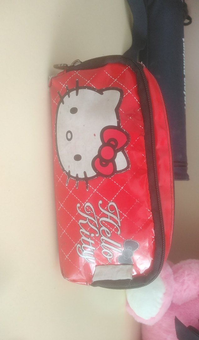 Renkli kırmızı Hello Kitty desenli, fermuarlı çocuk kalem kutusu. ✏️