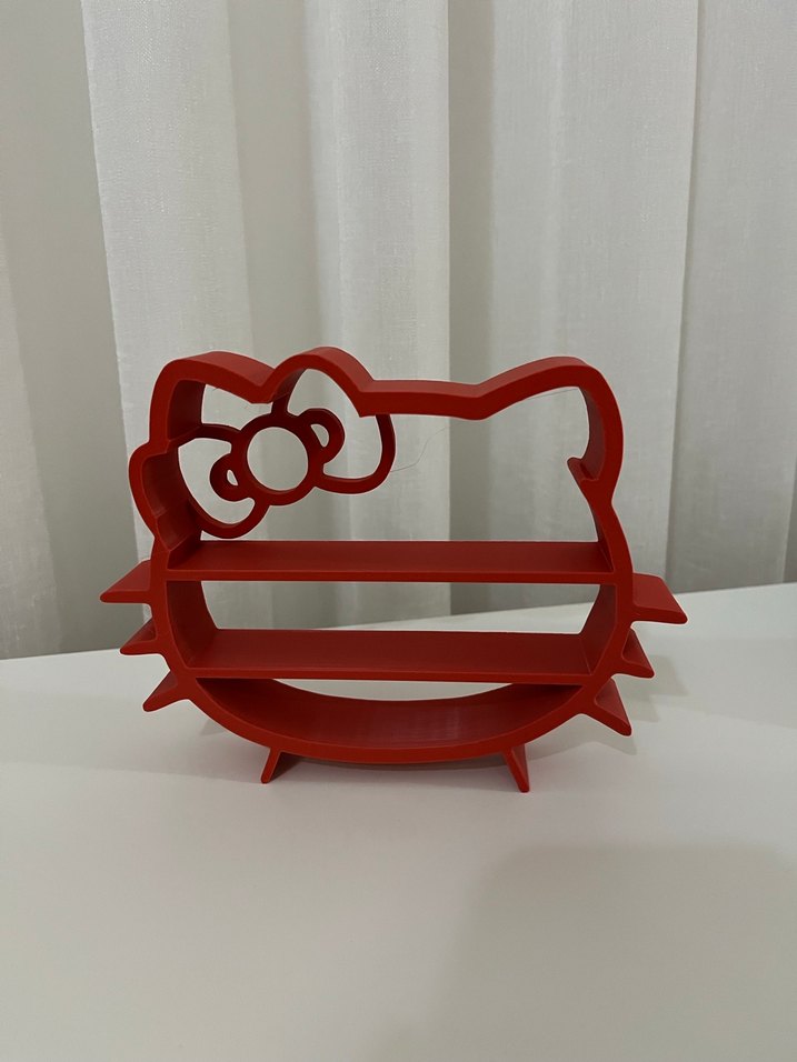 Kırmızı Hello Kitty şekilli raf, iki küçük rafla depolama sağlar. Renkli ve eğlenceli bir dekoratif üründür.