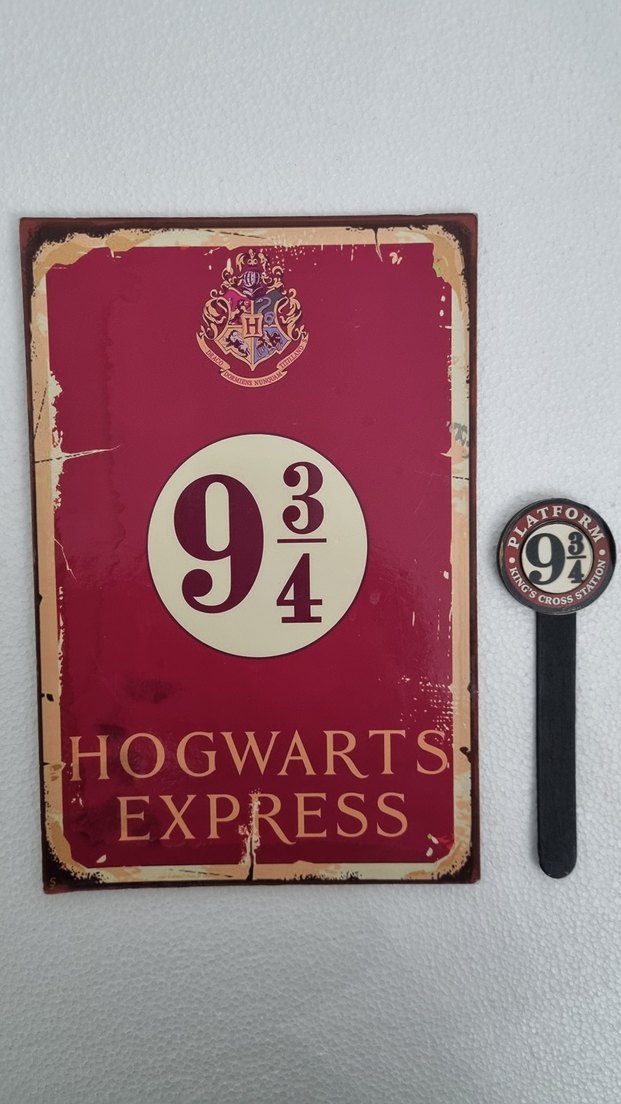 Kırmızı Hogwarts Express 9 3/4 tabelası ve Platform 9 3/4 rozeti içeren vintage tarzda erkek rozeti seti. Eski ve klasik bir görünümü vardır.