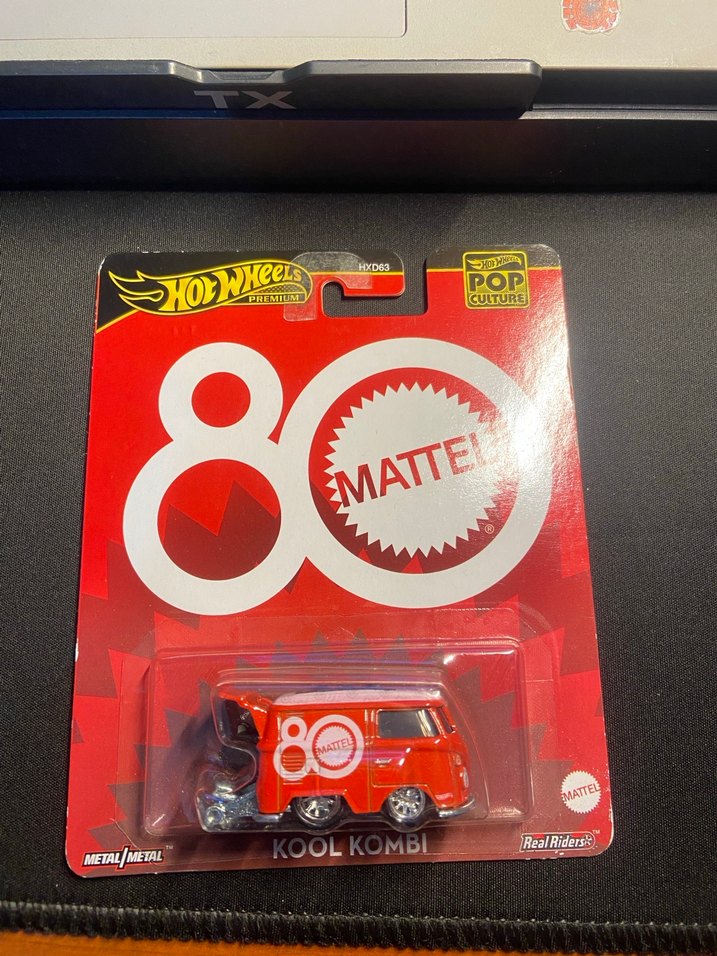 Kırmızı Hot Wheels Kool Kombi oyuncak araba, koyu canlı renklere ve detaylı tasarıma sahiptir. 80 Mattel Pop Culture koleksiyonundandır.
