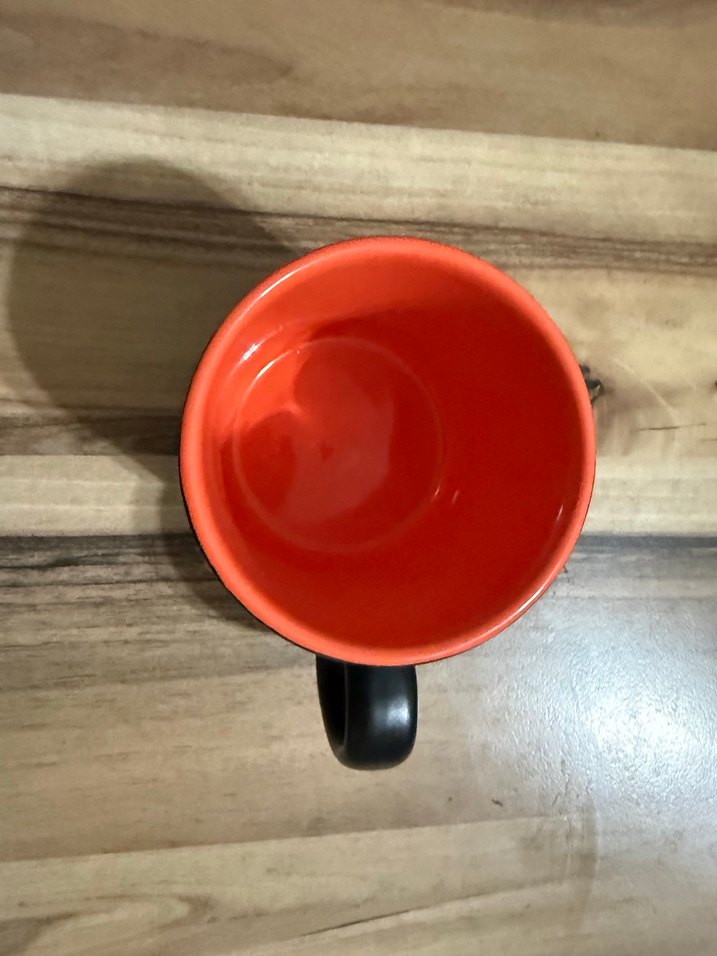 Kırmızı iç kısmı ve siyah kulpu ile dikkat çeken bir kupa. Sıcak içecekler için uygundur. ☕