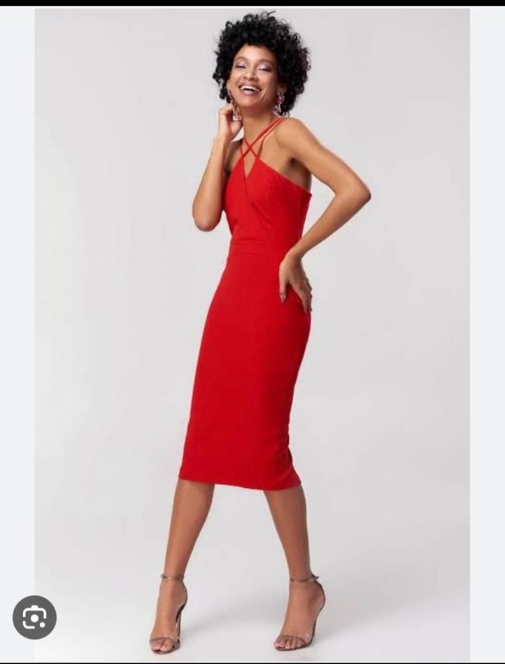 kırmızı sentetik kumaştan, V yakalı ve ince askılı, ve vücuda oturan kalem elbise. Romantik akşamlar için ideal. ✨ Boyunu kestirdim. Bir kere giydim.