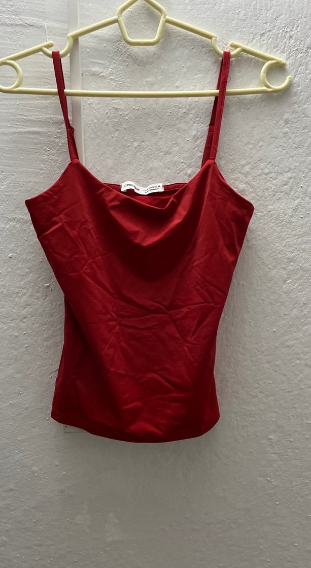Kadınlar için ince askılı, straplez yaka tarzında, kırmızı renkte, sade ve minimalist tasarıma sahip, sentetik kumaştan yapılmış, vücuda oturan atlet.