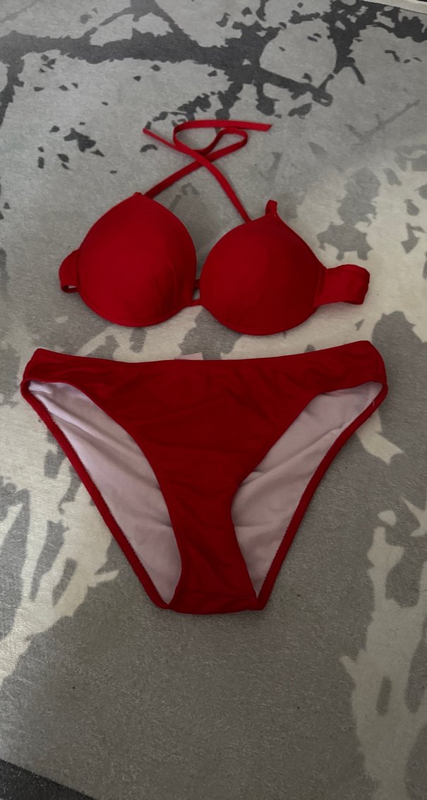 Bu kırmızı, ince askılı kadın bikini, dar kesimi ve desen içermeyen minimalist tasarımıyla plaj için uygundur. Rahat ve şık bir görünüm sunar.