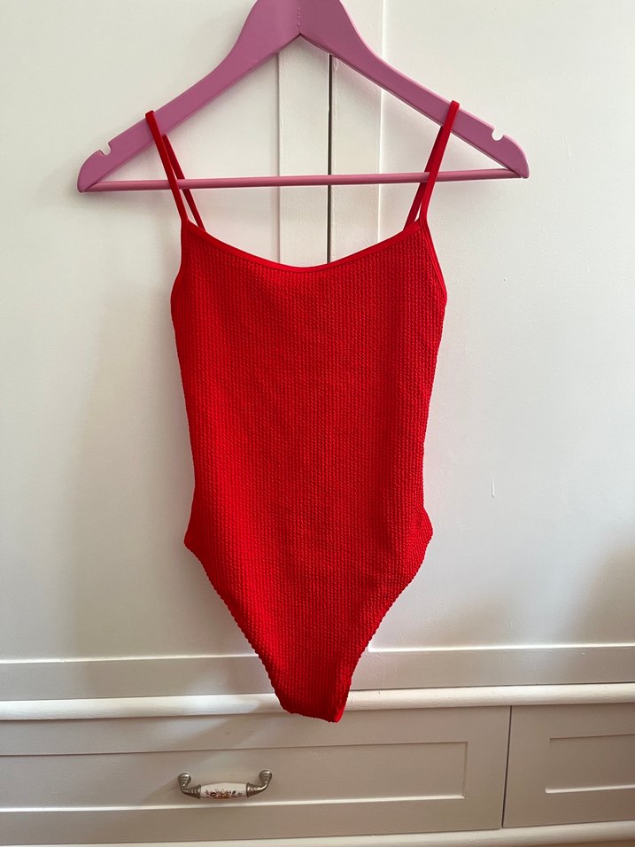 İnce askılı, kırmızı ve desen içermeyen bu mayo, sıkı kesimiyle cesur ve minimalist bir görünüm sunar. Plaj için ideal, zahmetsiz şıklık sağlar. Ürünü hiç kullanmadım, kalça kısmı brazilian şeklinde geliyor, ben s bedenini giydiğim için bunu satışa koydum. Defosuz çok şık rengi hiç solma yapmadı çok rahat bir mayo. Makul teklifleri kabul ediyorum.