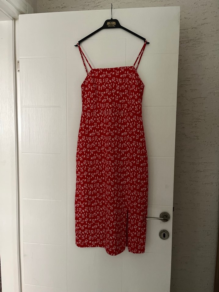 İnce askılı ve straplez yaka, drapeli tasarıma sahip kırmızı midi elbise. Yumuşak sentetik kumaştan, koyu kırmızı tie-dye desenlidir, günlük sokak stili için uygundur.