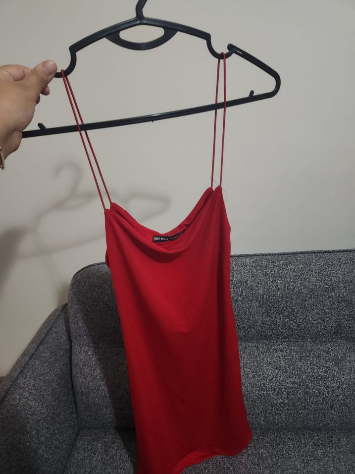 Kırmızı, ince askılı, ipeksi kumaşlı kadın atlet. Vücuda oturan kesimi ve drapeli detayıyla cesur sokak stili için uygun.✨