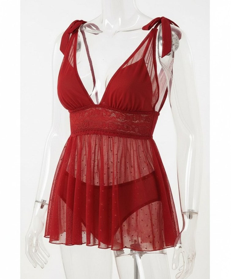 Kırmızı, ince askılı ve kısa mini boyda, şeffaf kumaş detaylı, bohem tarzda ve vücuda oturan kadın geceliği.