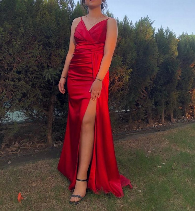 Kırmızı derin yırtmaçlı kuyruklu gece elbisesi