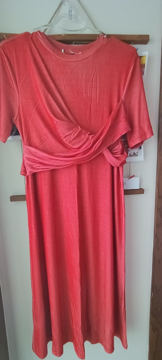 Kırmızı, uzun ve drapeli elbise. Yuvarlak yakalı, kısa kollu ve şık bir görünüm sunar. Minimalist bohem tarzda.