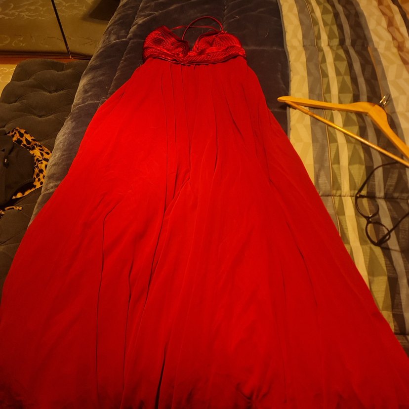 Kırmızı, özel detay ince çapraz askılı eteği şifon drapeli uzun abiye elbise, fit kesimiyle parti için şık bir görünüm sunar. Kolsuz ve uzun boyda.