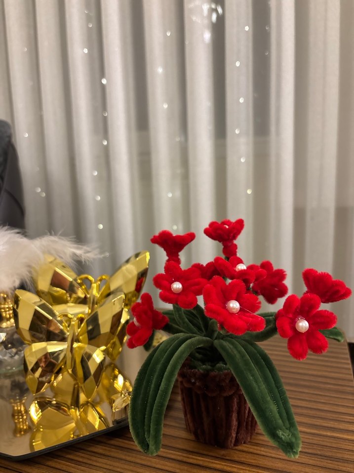 Kahverengi saksıda inci detaylı kırmızı çiçekler ve kadifemsi yeşil yapraklarla ev dekorasyonuna renk katan parça.