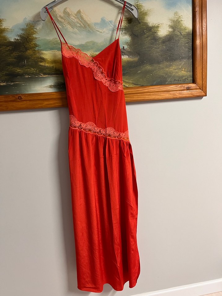 Parlak kırmızı kumaştan, dar kesim uzun gecelik. İnce ip askılar ve dantel detaylarıyla vintage bohem tarzını yansıtıyor.