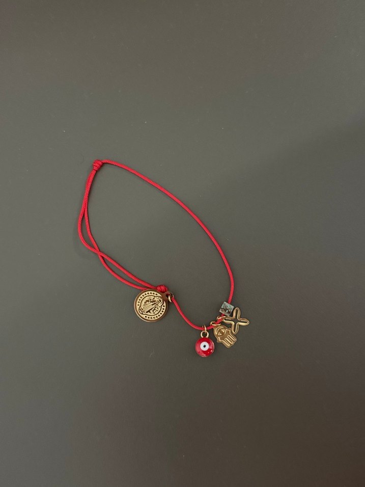 Kırmızı ipten yapılmış, zincir detaylı ve işlemeli figürlü, bohem ve minimalist tarzda kadın bilekliği. Günlük kullanıma uygundur.