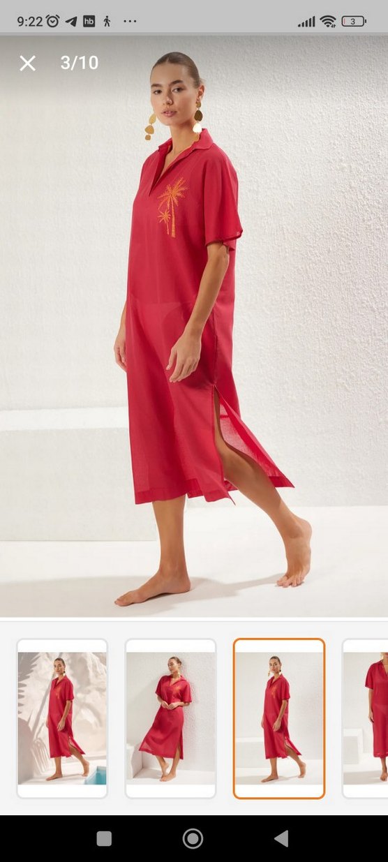 V yaka, kısa kollu, bol kesim uzun elbise. İpek görünümlü kumaştan, drapeli ve parlak kırmızı renkte. Yan yırtmaçlı, minimal ve çağdaş tarzda. plaj elbise ml uyumlu