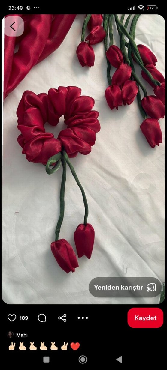 Kırmızı ipek kurdele saç tokası, lale uçlu detaylarla minimalist ve avangart tarzı birleştirir. Renkli ve karşı kültür stilleri için idealdir.