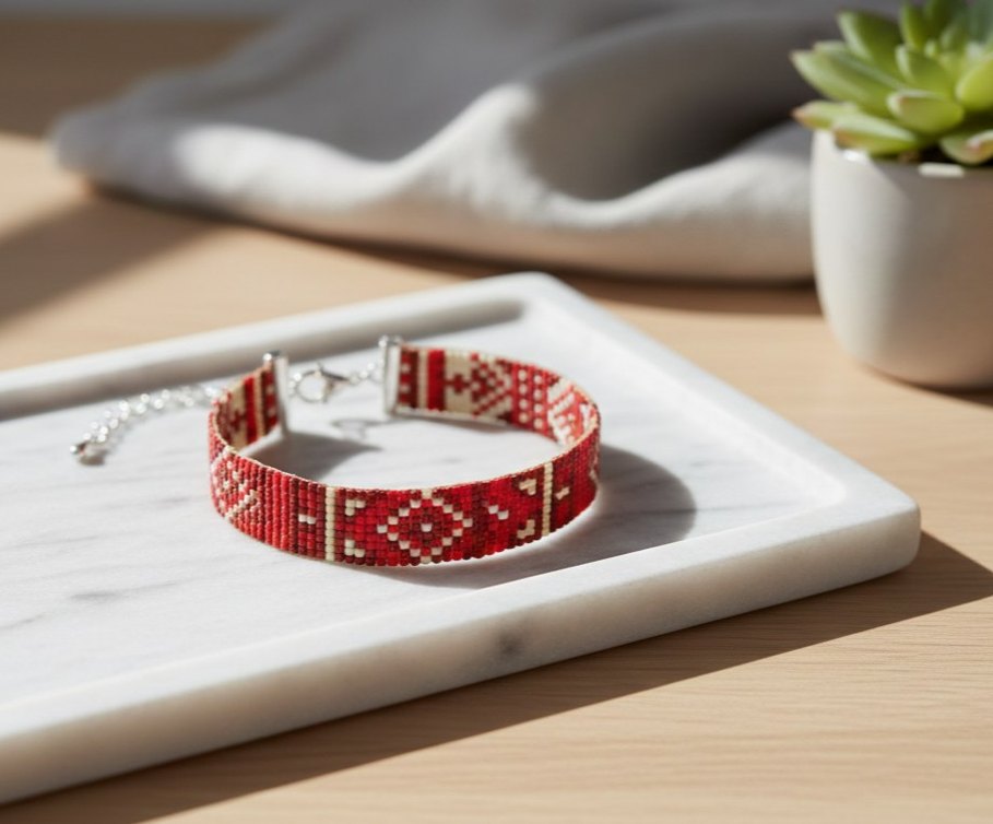 Kırmızı İşlemeli Boncuklu Kadın Bileklik