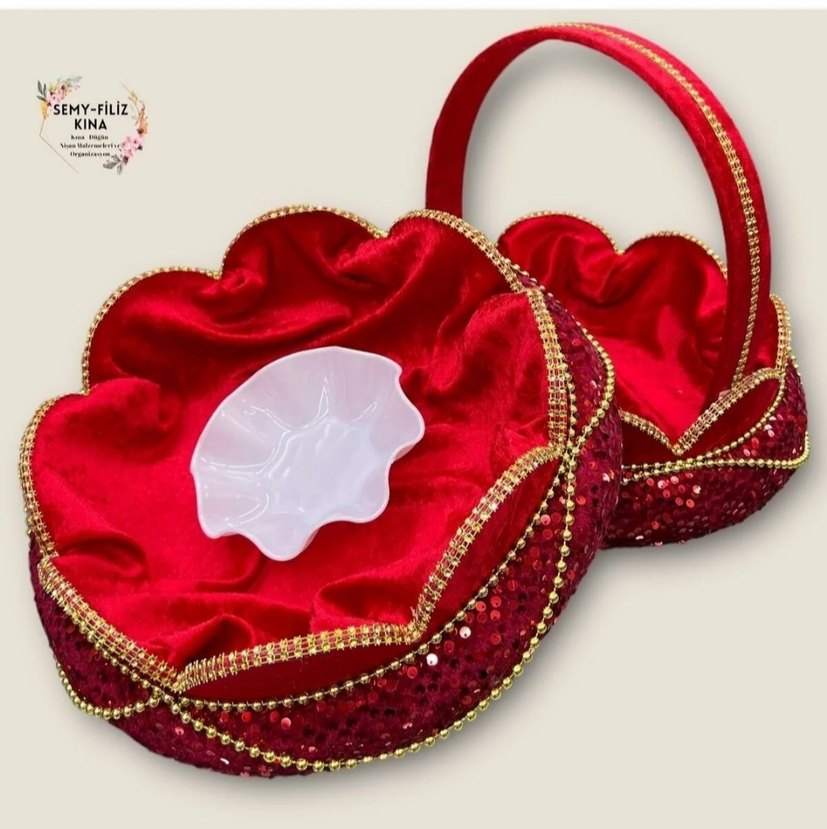 Kırmızı İşlemeli Boncuklu kına sepeti takımı