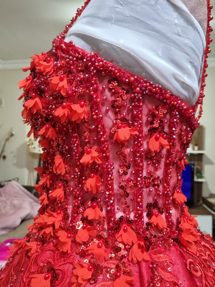 Kırmızı İşlemeli Boncuklu Straplez Nişan Elbisesi