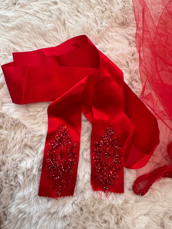 Kırmızı boncuk işlemeli kuşak duvak el gülü ve eldiven içerir