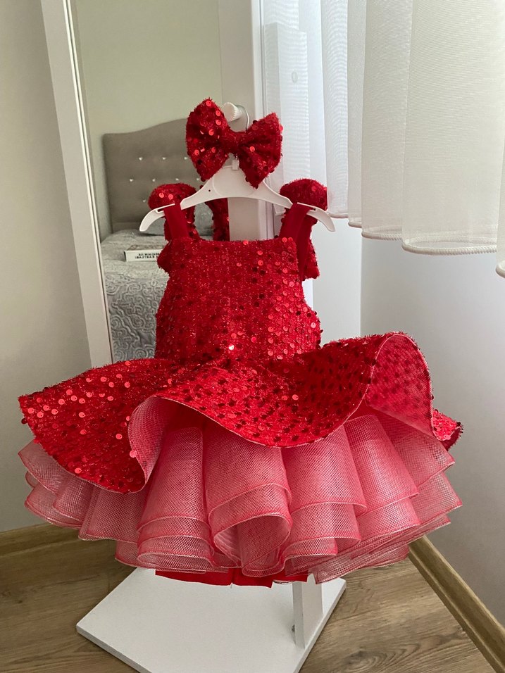 Kırmızı İşlemeli Fırfırlı Kız Çocuk Elbise 1-2 yaş