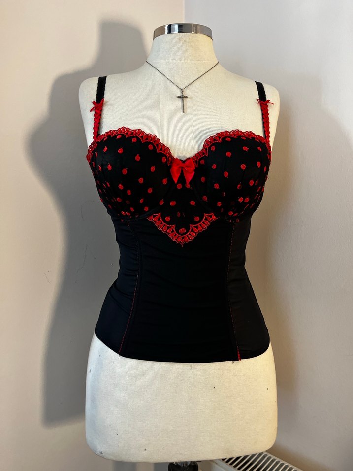 Dar kesim gotik büstiyer, straplez yakalı ve askılıdır. Koyu kumaş üzerine kırmızı işlemeler ve düğme detayları bulunur. Romantik akşamlar için uygundur. 80C