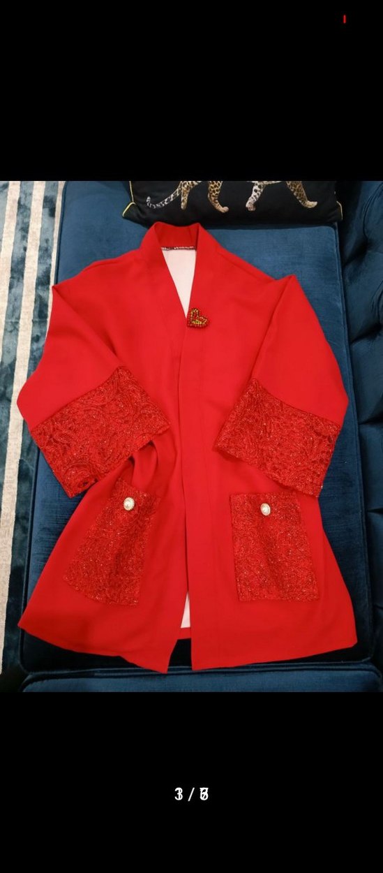 Kırmızı uzun kaban, düğmeli ve kesik yaka detaylıdır. Uzun kollu ve cepler ile manşetlerde işlemeli detaylara sahiptir. Sentetik parlak kumaştan yapılmıştır, günlük kullanıma uygundur.