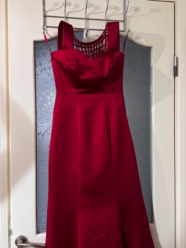 Kırmızı renk, işlemeli ve parlak kumaştan yapılmış, straplez ve kolsuz, vücuda oturan midi abiye elbise. Düğünler için uygun şık bir modeldir.
