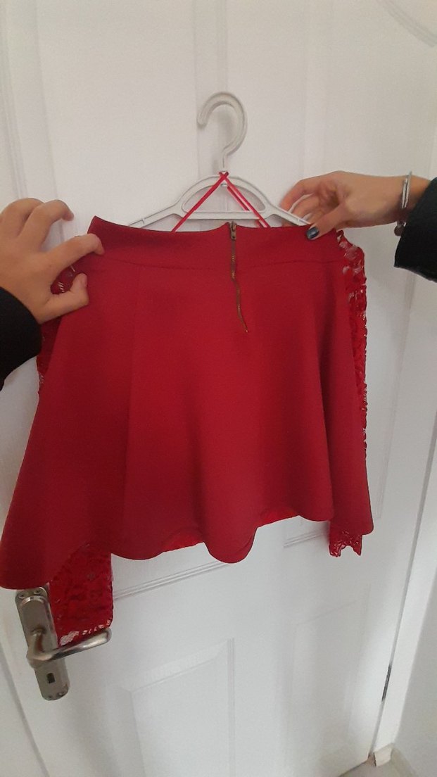 sadece etek satistadir arkasindaki dantelli kirmzii bluz ile cok guzel kombinleniyor isteyene ikisini beraber satabilirim. Parlak kırmızı sentetik kumaştan, işlemeli detaylı, drapeli ve dar kesim mini etek. Bohem ve minimalist tarzı yansıtır. ✨