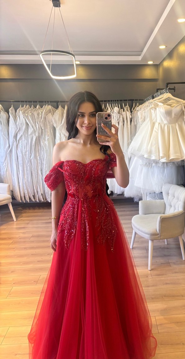 Kırmızı, işlemeli ve boncuk detaylı, straplez kısa kollu, uzun ve vücuda oturan abiye elbise. Parlak dokusuyla düğünler için ideal.