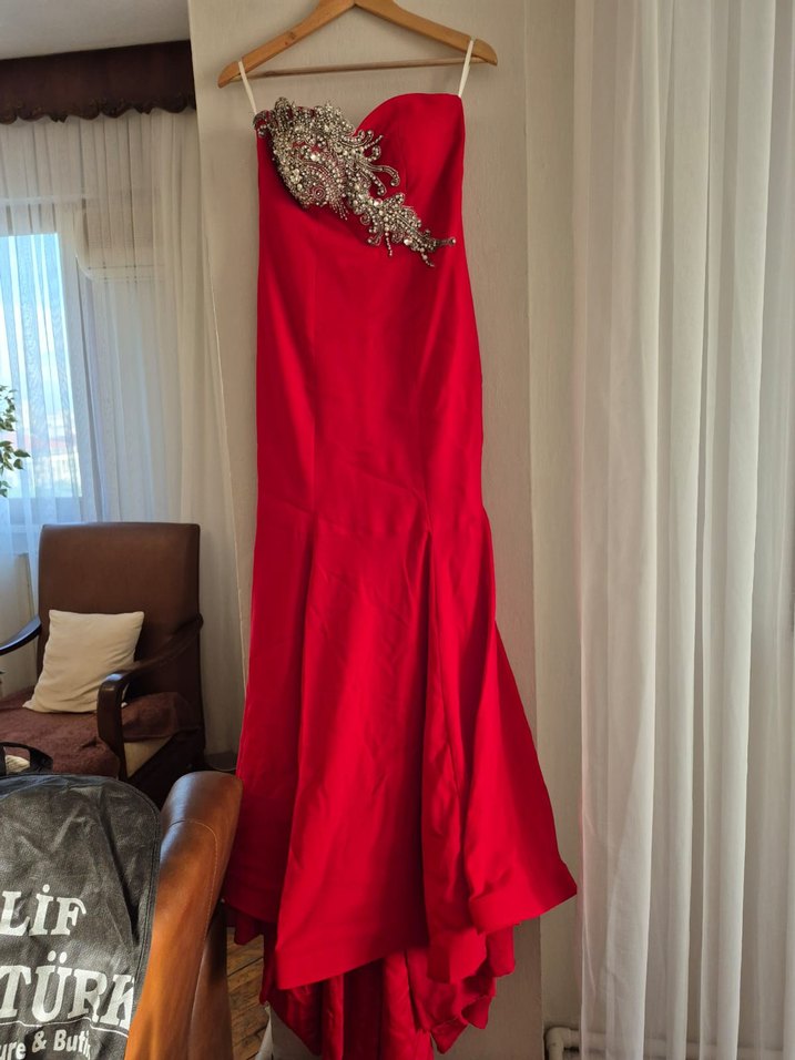Uzun, kırmızı renkli, straplez ve vücuda oturan bu abiye elbise, şık drapeli tasarımı ve zarif işlemeleriyle düğünler için uygundur.