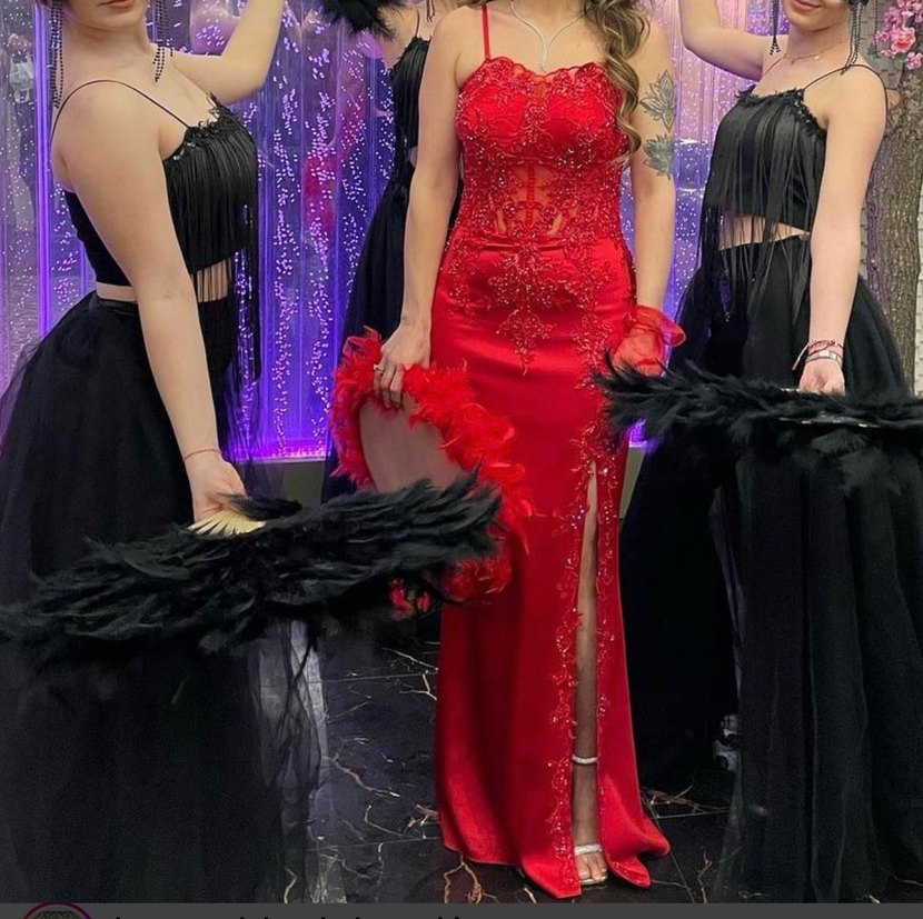 Kırmızı uzun, işlemeli ve payetli abiye, straplez yaka ve askılı kollara sahip, klasik modern tarzda şık bir seçimdir. 36 beden bir kez giyildi kına kıyafeti olarak