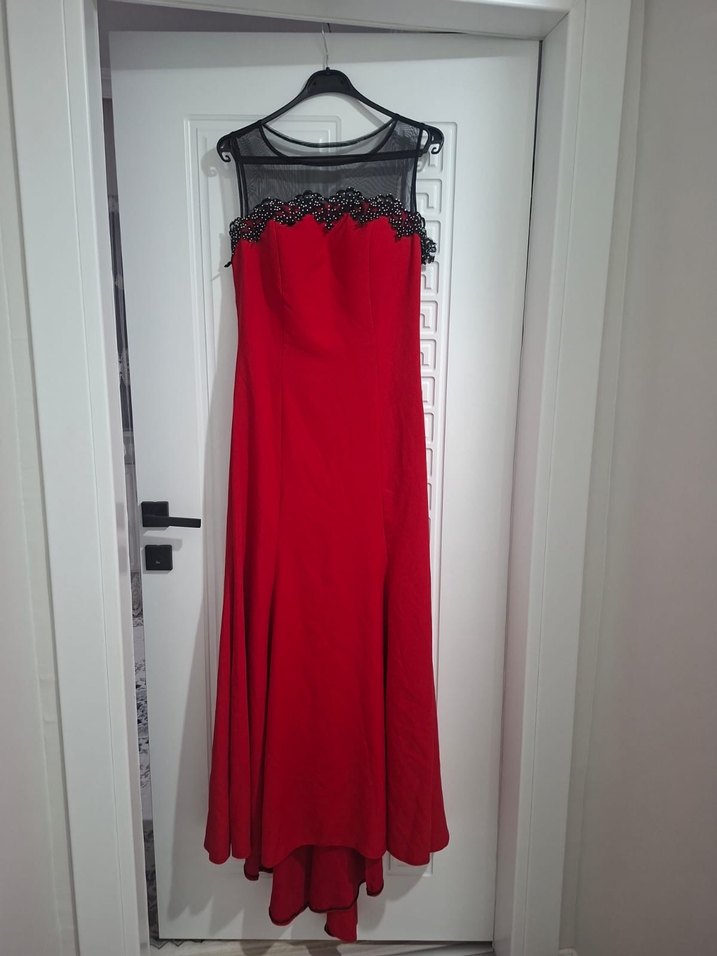 Kırmızı İşlemeli Straplez Uzun Abiye Elbise