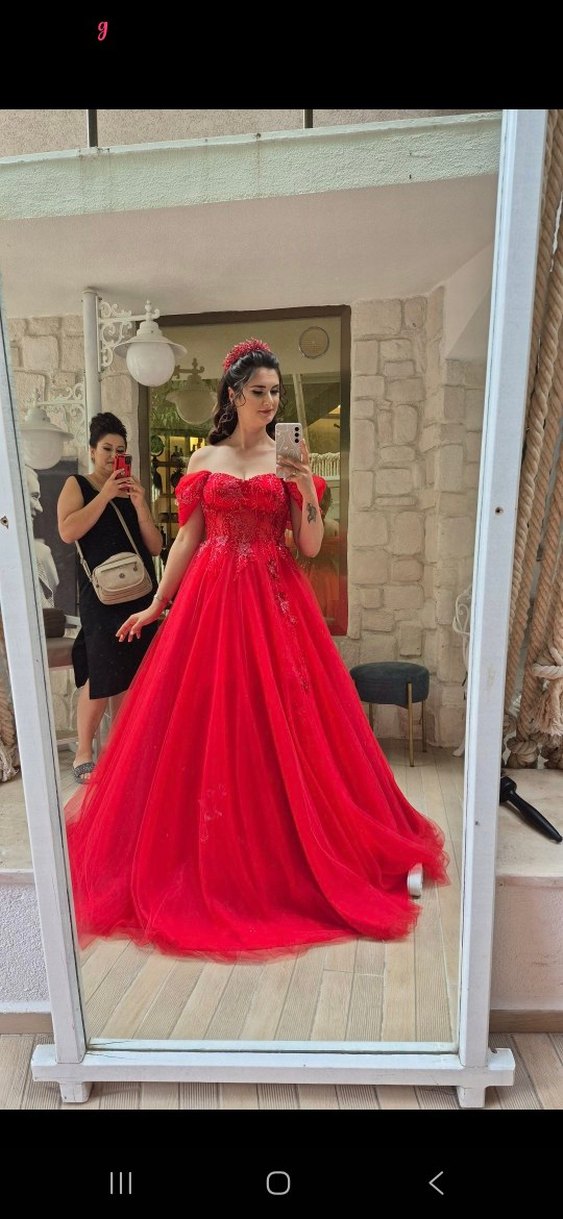 Kırmızı, straplez, kısa kollu, işlemeli ve boncuk detaylı uzun elbise, düğün için modern klasik şıklık sunar.
