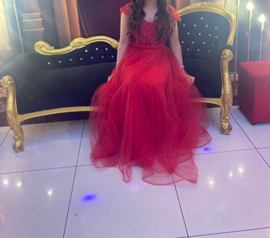 Kırmızı İşlemeli Taşlı Uzun Abiye Elbise