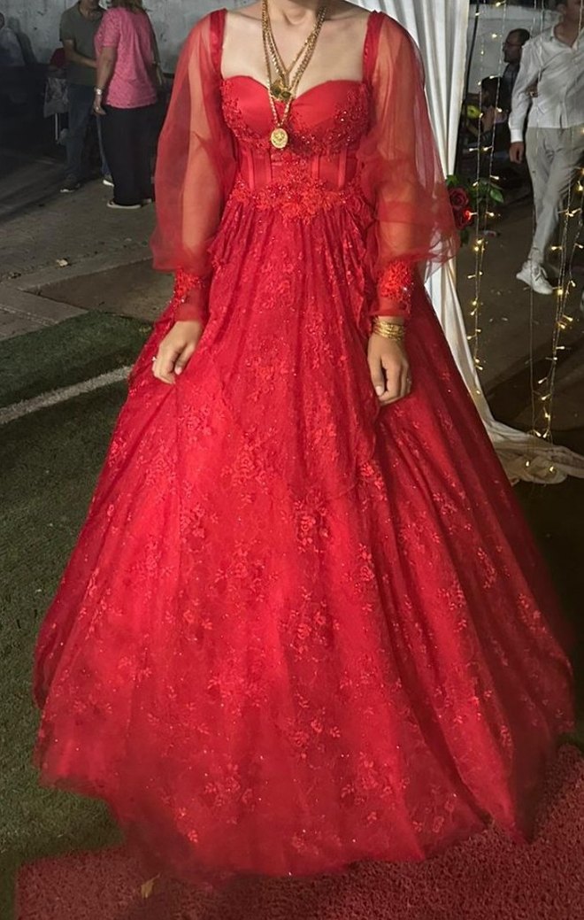 Kırmızı işlemeli tül Kollu Nişan kına Elbisesi