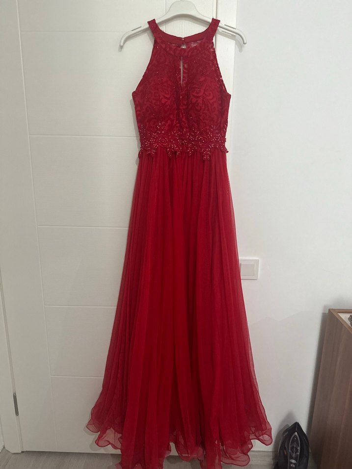 Kırmızı İşlemeli Uzun Abiye Elbise