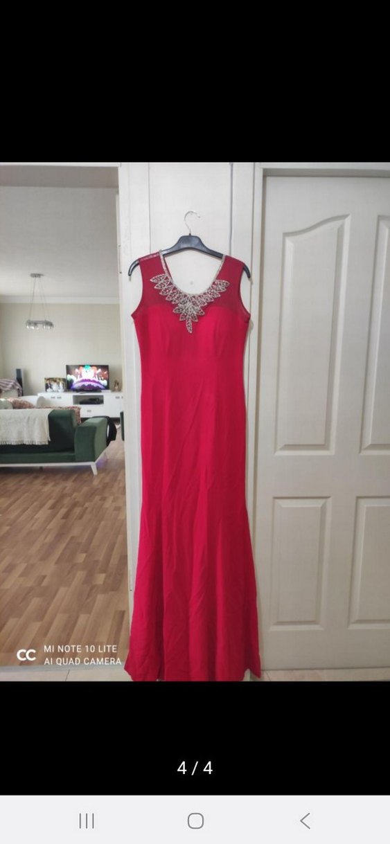 Kırmızı İşlemeli Uzun Abiye Elbise