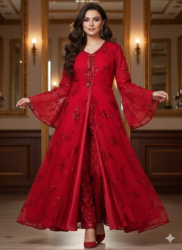 Kırmızı uzun abiye elbise, V yaka ve uzun kolludur. Salaş ve drapeli kesimi, işlemeli parlak detaylarla süslenmiştir, düğünler için uygundur. 3 parça tam takımdır 38 40 bedene uygundur iç parçalarında defoları var ürünü inceleyerek satın alınız