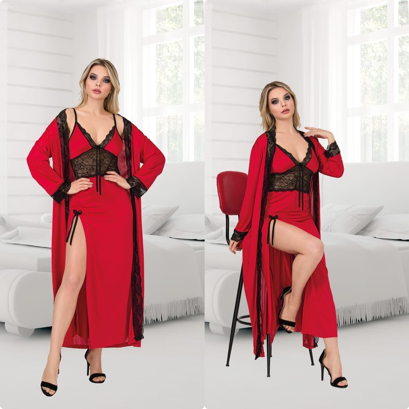 Kırmızı İşlemeli Uzun Kadın Gecelik Takımı